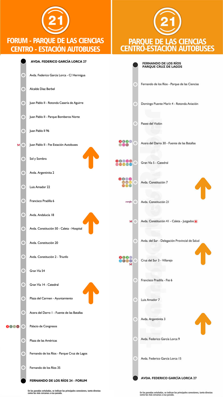 Línea 21. Parque de las Ciencias - Centro - Estación de AutobusesConsulta Plano :: Secuencia de Paradas - Itinerarios.